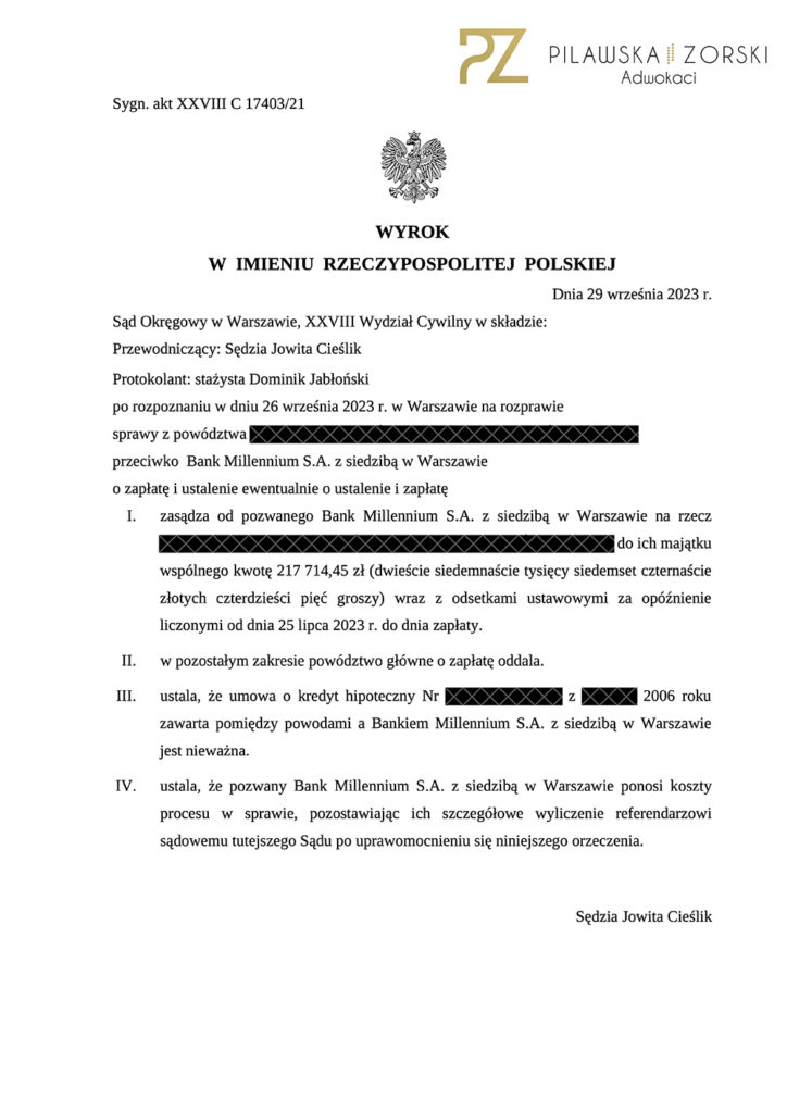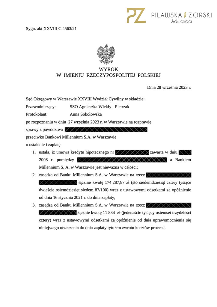 Dziś informujemy o kolejnych korzystnych wyrokach z ubiegłego tygodnia, wydanych przez Sąd Okręgowy w Warszawie, XXVIII Wydział Cywilny, w sprawach przeciwko Bankowi Millennium S.A. z siedzibą w Warszawie.