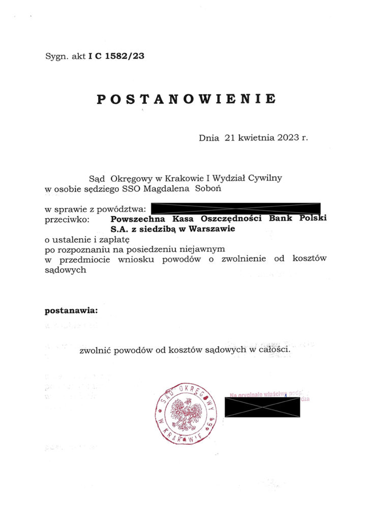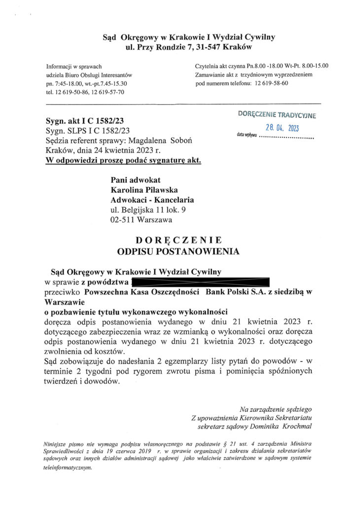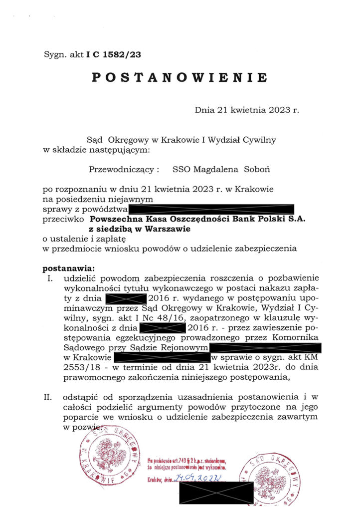 I dzisiaj, dnia 28 kwietnia 2023 roku, dostaliśmy informację, że Sąd Okręgowy w Krakowie postanowieniem z dnia 21 kwietnia 2023 roku w sprawie o sygn. akt I C 1582/23 zawiesił postępowanie egzekucyjne do czasu prawomocnego rozstrzygnięcia w sprawie oraz podzielił w całości naszą argumentacją – w tym zakresie odstąpił nawet od uzasadnienia, wskazując, że wniosek jest uzasadniony w całości. Sprawa była tym bardziej ciekawa, że wczoraj otrzymaliśmy informację, że został już wyznaczony termin licytacji nieruchomości. Istny thriller❗️❗️❗️