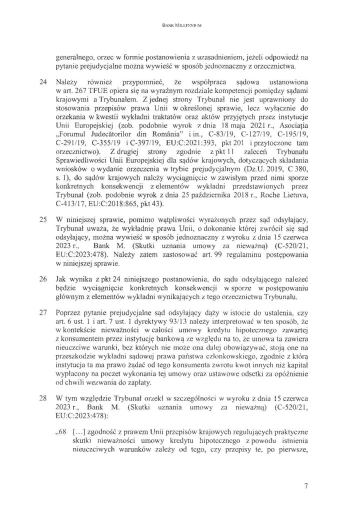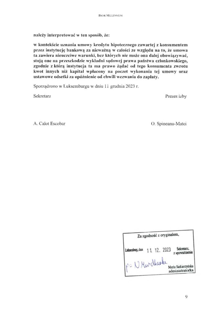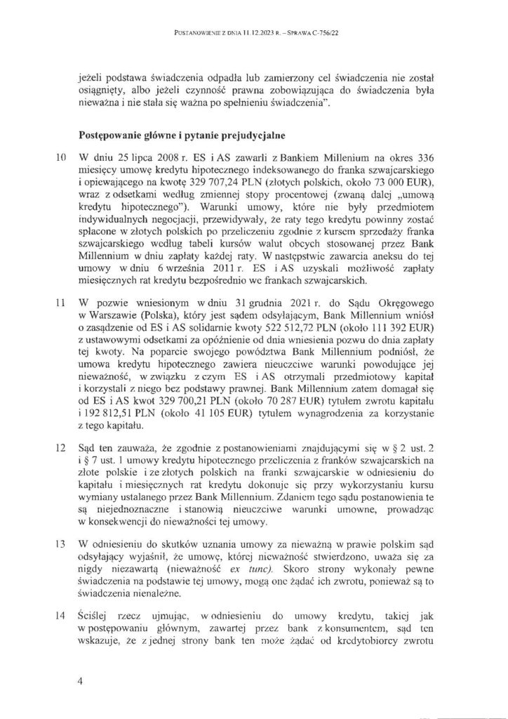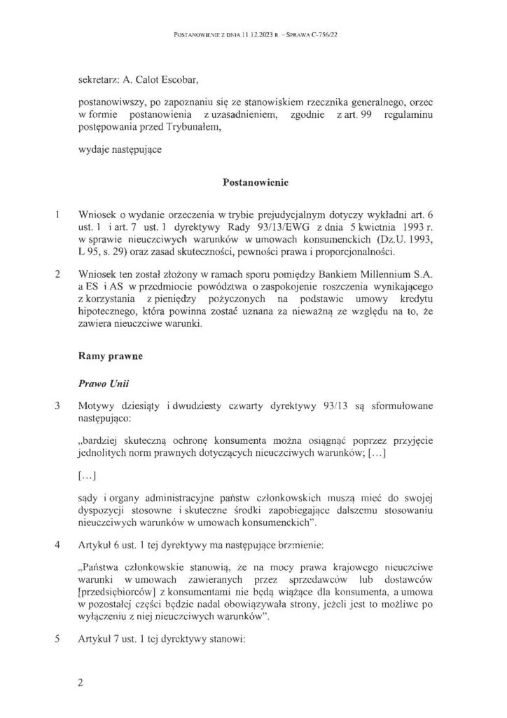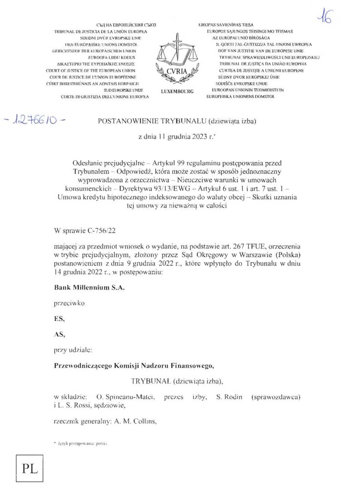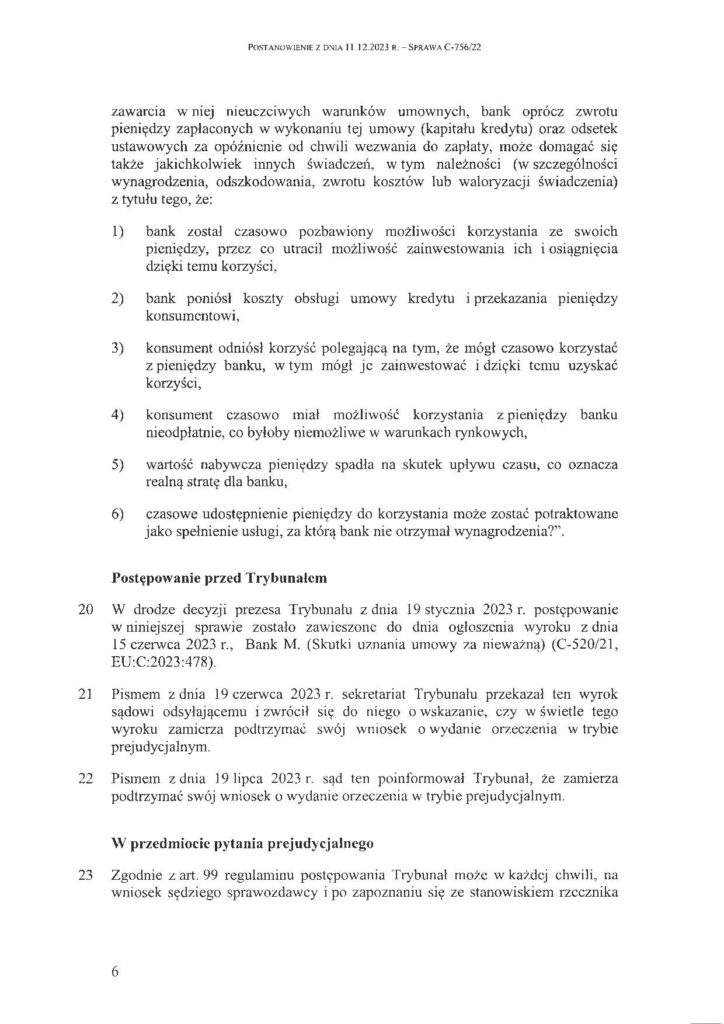 11 grudnia 2023 roku w sprawie C-756/22 wydał postanowienie, w którym jednoznacznie wskazał, że pomimo wątpliwości wyrażonych przez polski sąd, Trybunał uważa, że wykładnię prawa Unii, o dokonanie której zwrócił się polski sąd, można wywieść w sposób jednoznaczny z wyroku z dnia 15 czerwca 2023 roku.