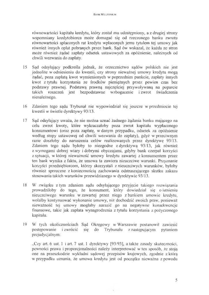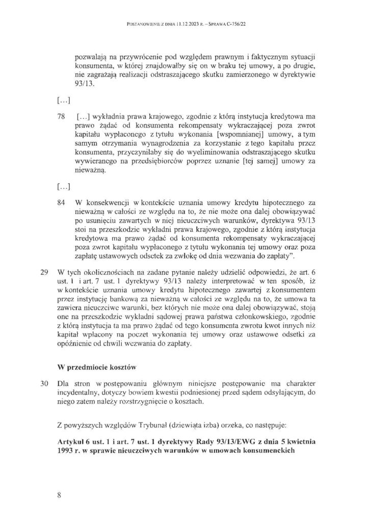 1993 roku w sprawie nieuczciwych warunków w umowach konsumenckich należy interpretować w ten sposób, że w kontekście uznania umowy kredytu hipotecznego zawartej z konsumentem przez instytucję bankową za nieważną w całości ze względu na to, że umowa ta zawiera nieuczciwe warunki, bez których nie może ona dalej obowiązywać, stoją one na przeszkodzie wykładni sądowej prawa państwa członkowskiego, zgodnie z którą instytucja ta ma prawo żądać od tego konsumenta zwrotu kwot innych niż kapitał wpłacony na poczet wykonania tej umowy oraz ustawowe odsetki za opóźnienie od chwili wezwania do zapłaty”.