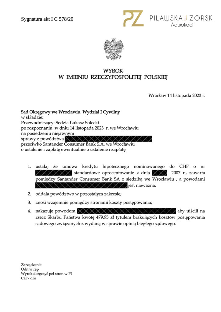 Informujemy, że Sąd Okręgowy we Wrocławiu, I Wydział Cywilny, sędzia Łukasz Solecki, w sprawie o sygn. akt I C 578/20 z powództwa naszych Klientów przeciwko Santander Consumer Bank S.A. z siedzibą we Wrocławiu w dniu 14 listopada 2023 roku wydał wyrok, w którym:
