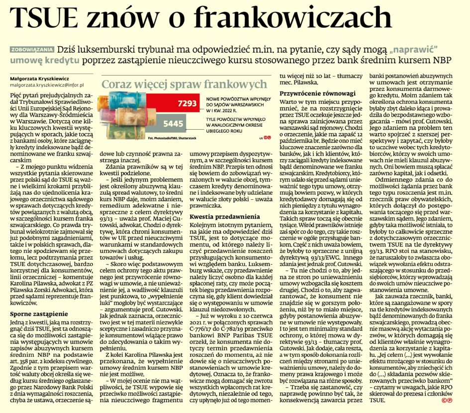 Komentarz mec. Karoliny Pilawskiej w sprawie wyroku TSUE z 8 września 2022 roku, sygn. akt C-80/21, 81/21 i 82/21 dot. polskich Frankowiczów, który ukazał się w wydaniu papierowym Dziennika Gazety Prawnej w dniu 8 września 2022 roku.