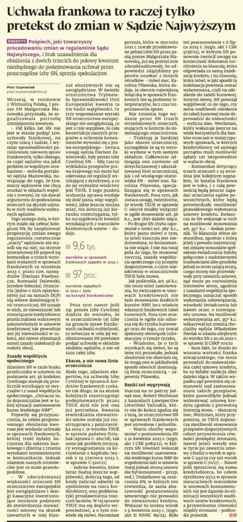 W wydaniu Dziennika Gazety Prawnej z 9 listopada 2023 roku ukazał się artykuł opisujący sytuację w Sądzie Najwyższym i jej wpływ na tzw. sprawy frankowe z komentarzem adw. Karoliny Pilawskiej.