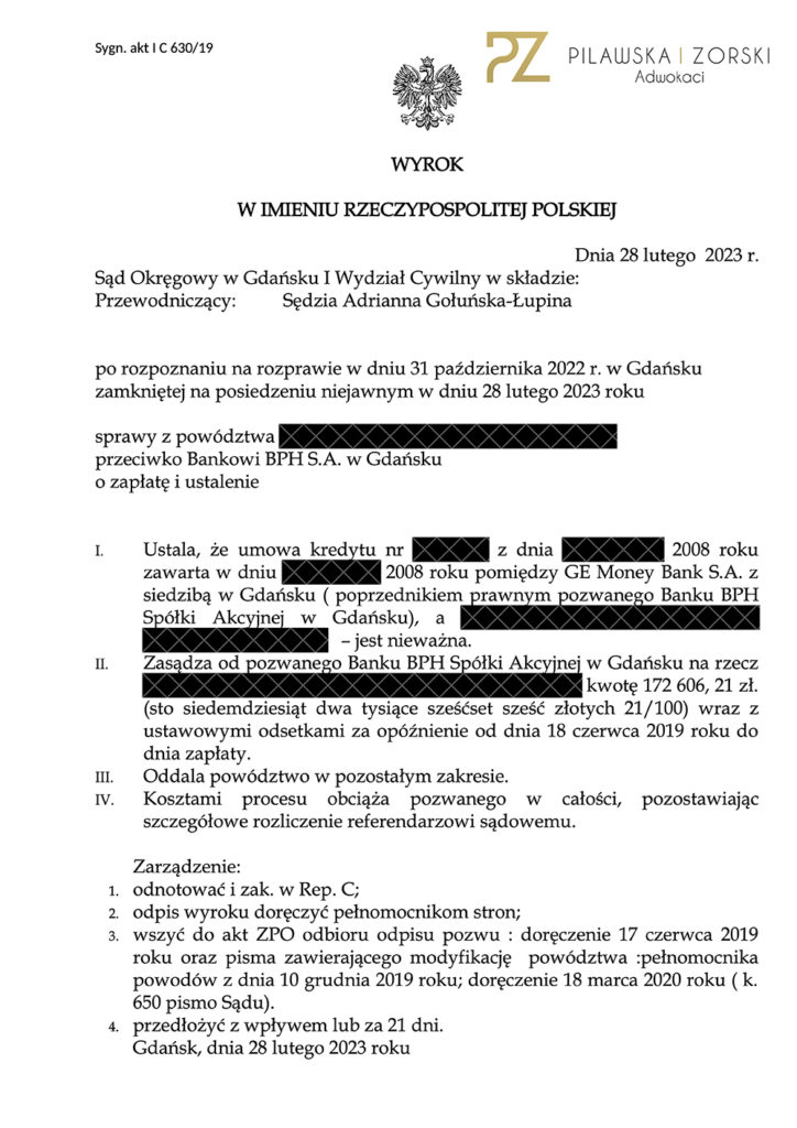 Dawno nie pisaliśmy o sukcesach z Bankiem BPH S.A., więc czas to nadrobić. Informujemy, że w dniu 28 lutego 2023 roku Sąd Okręgowy w Gdańsku, I Wydział Cywilny, sędzia Adrianna Gołuńska – Łupina, w sprawie z powództwa naszych Klientów przeciwko Bankowi BPH S.A. z siedzibą w Gdańsku, sygn. akt I C 630/19, na posiedzeniu niejawnym wydał wyrok, w którym: