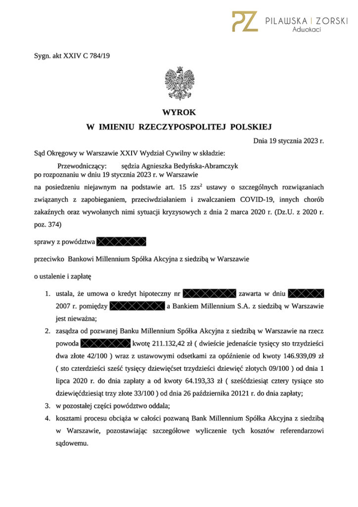 Tym razem umowa kredytu indeksowanego Banku Millennium S.A. z 2007 roku i w akcji Sąd Okręgowy w Warszawie, XXIV Wydział Cywilny, w osobie SSO Agnieszki Bedyńskiej – Abramczyk, która w wyroku z 19 stycznia 2023 roku wydanym w sprawie o sygn. akt XXIV C 784/19: