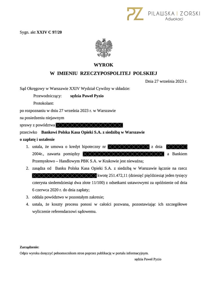 Tym razem Umowa kredytu dawnego Banku Przemysłowo – Handlowym PBK S.A. z siedzibą w Krakowie z 2004 roku i w akcji Sąd Okręgowy w Warszawie, XXIV Wydział Cywilny, SSO Paweł Pyzio, który w wyroku z 27 września 2023 roku wydanym w sprawie o sygn. akt XXIV C 97/20: