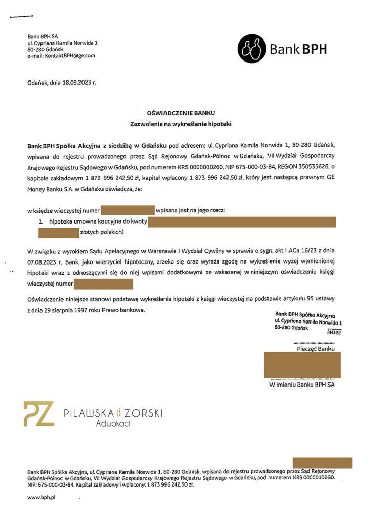 List mazalny wydany przez Bank BPH S.A. z siedzibą w Gdańsku jest efektem prawomocnie zakończonego procesu prowadzonego przez naszą Kancelarię, którego przebieg prezentujemy poniżej: