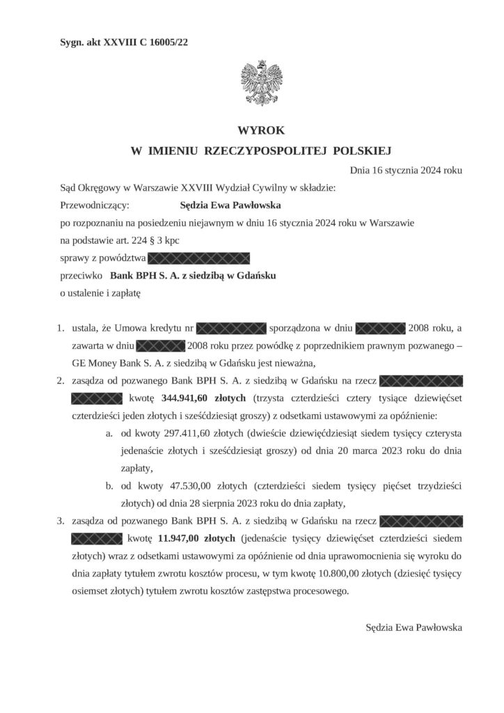 Dziś Sąd Okręgowy w Warszawie doręczył nam wyrok wydany w dniu 16 stycznia 2024 roku na posiedzeniu niejawnym w sprawie z powództwa naszej Klientki przeciwko Bankowi BPH S.A. z siedzibą w Gdańsku.