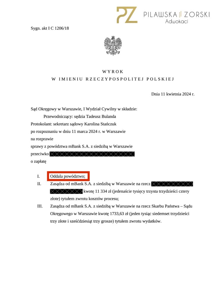 Informujemy, że wyrokiem z dnia 11 kwietnia 2024 roku Sąd Okręgowy w Warszawie, I Wydział Cywilny, SSO Tadeusz Bulanda, w sprawie z powództwa mBank S.A. przeciwko naszym Klientom, sygn. akt I C 1206/18, oddalił w całości powództwo mBank S.A. z tytułu wypowiedzianej Umowy kredytu hipotecznego w złotych polskich z 2008 roku, przewalutowanego w 2009 roku na walutę frank szwajcarski.