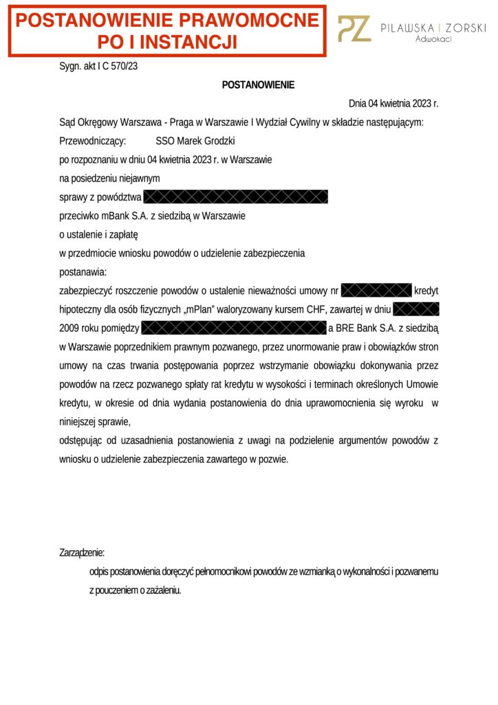Rzadko zdarzają się takie posty, bo i takie sytuacje należą do rzadkości. W tej sprawie Sąd Okręgowy dla Warszawy – Pragi w Warszawie, I Wydział Cywilny, sygn. akt I C 570/23, w dniu 4 kwietnia 2023 roku wydał postanowienie o zabezpieczeniu, na mocy którego zwolnił naszych Klientów z obowiązku płacenia rat kredytu na rzecz mBank S.A. na czas trwania procesu. Postanowienie zostało doręczone bankowi, który nie dokonał jego zaskarżenia, co oznacza, że to postanowienie jest WYKONALNE i PRAWOMOCNE.