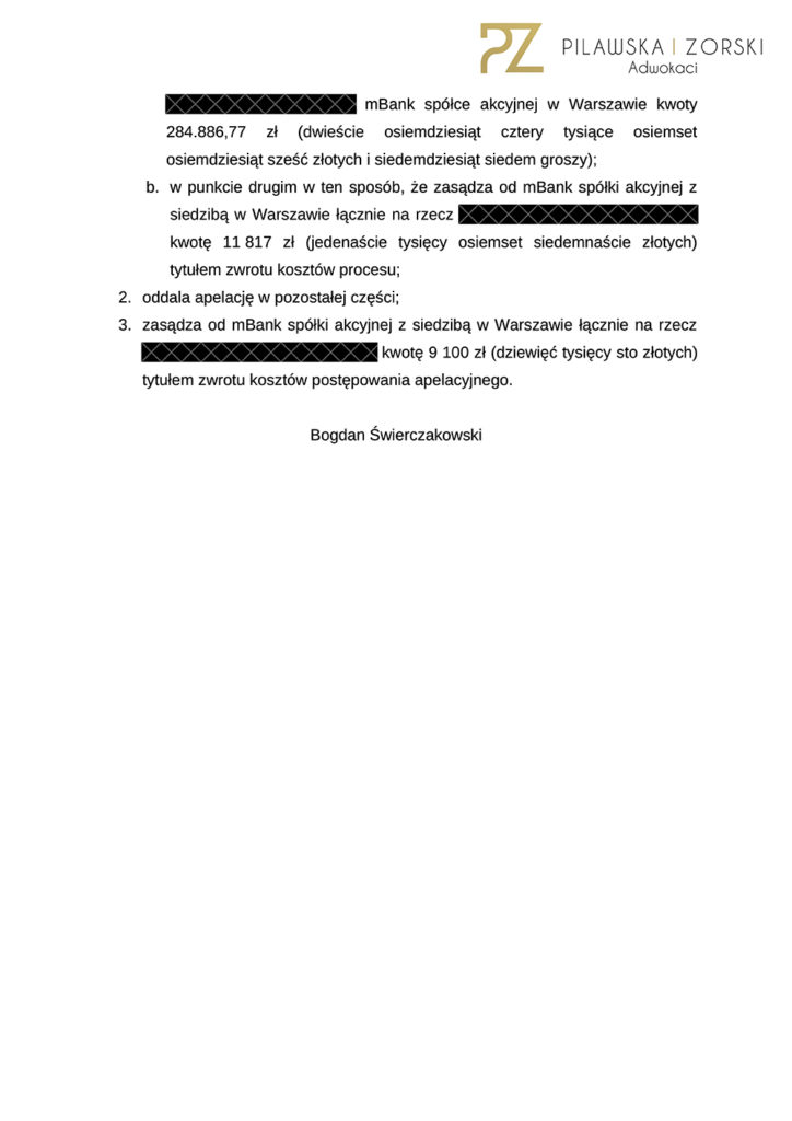 ✅ zasądził od mBank S.A. na rzecz Powodów kwoty: