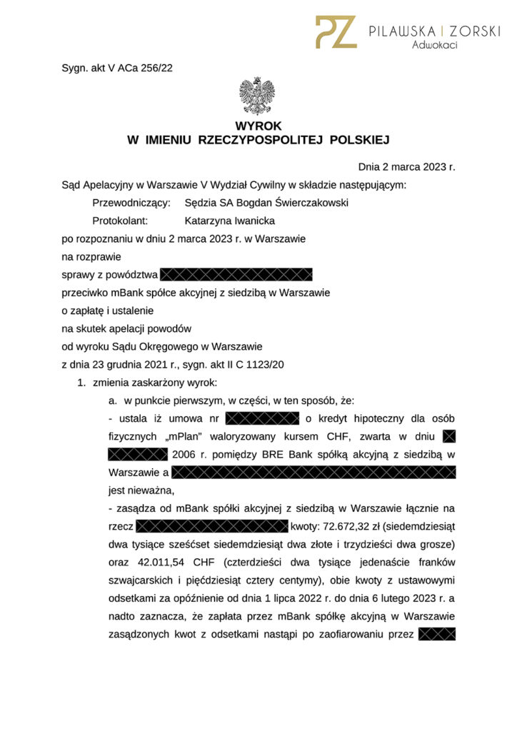 Sąd Apelacyjny w Warszawie, I Wydział Cywilny, w osobie SSA Anny Strączyńskiej, w dniu 2 czerwca 2022 roku w sprawie o sygn. akt I ACa 188/22 wydał wyrok, w którym oddalił w całości apelację mBank S.A. od wyroku Sądu Okręgowego w Warszawie, I Wydział Cywilny, SSO Bożena Chłopecka, z dnia 18 listopada 2021 roku, sygn. akt I C 300/18 i: