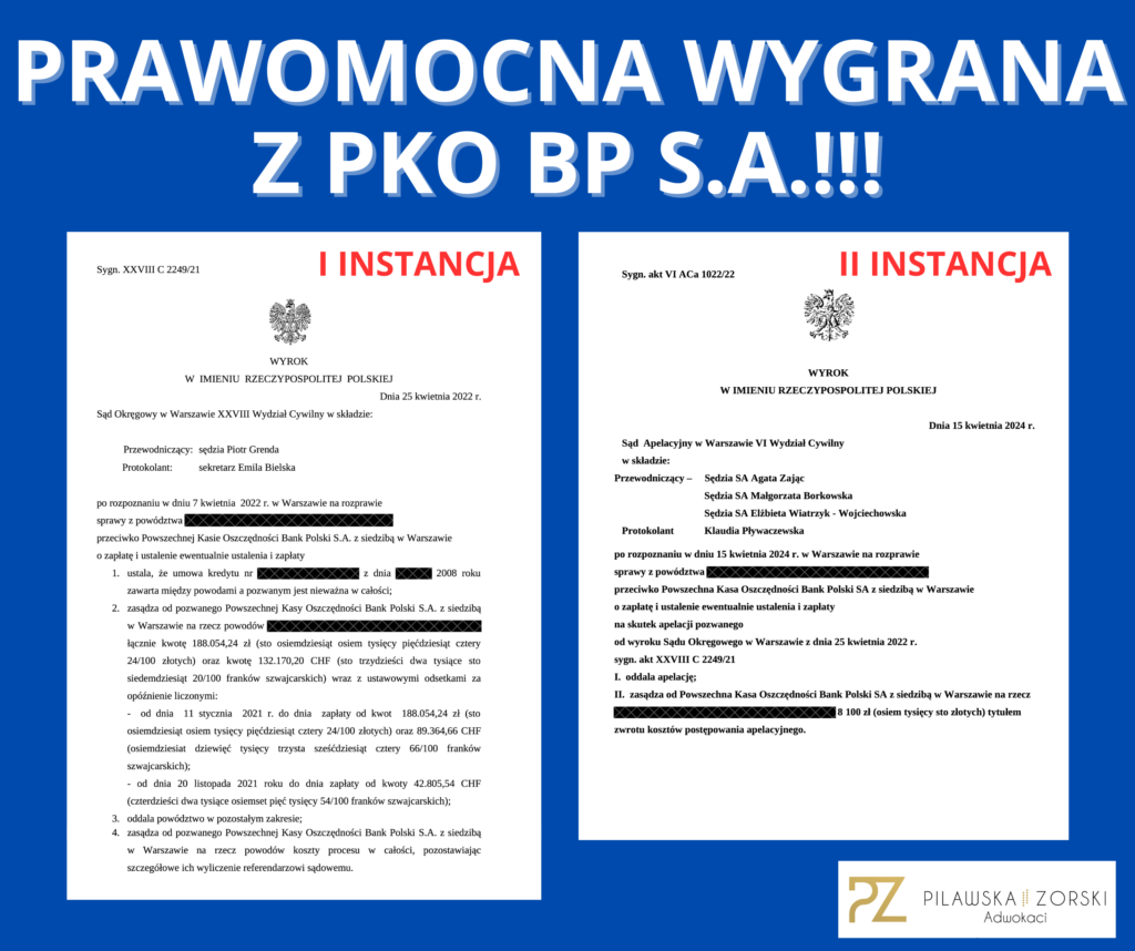 Z radością informujemy, że w dniu 15 kwietnia 2024 roku Sąd Apelacyjny w Warszawie, VI Wydział Cywilny, SSA Agata Zając, SSA Małgorzata Borkowska i SSA Elżbieta Wiatrzyk – Wojciechowska, wydał PRAWOMOCNY wyrok w sprawie z powództwa naszych Klientów przeciwko PKO BP S.A. o sygn. akt VI ACa 1022/22, w którym oddalił w całości apelację PKO BP S.A. od wyroku Sąd Okręgowego w Warszawie, XXVIII Wydział Cywilny, SSO Piotr Grenda, sygn. akt XXVIII C 2249/21, w którym Sąd I instancji: