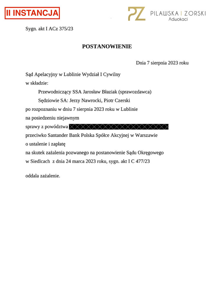 Teraz informujemy, że postanowienie jest PRAWOMOCNE, ponieważ Sąd Apelacyjny w Lublinie, I Wydział Cywilny, w dniu 7 sierpnia 2023 roku ODDALIŁ ZAŻALENIE Santander Bank Polska S.A. z siedzibą w Warszawie (sygn. akt I ACz 375/23).