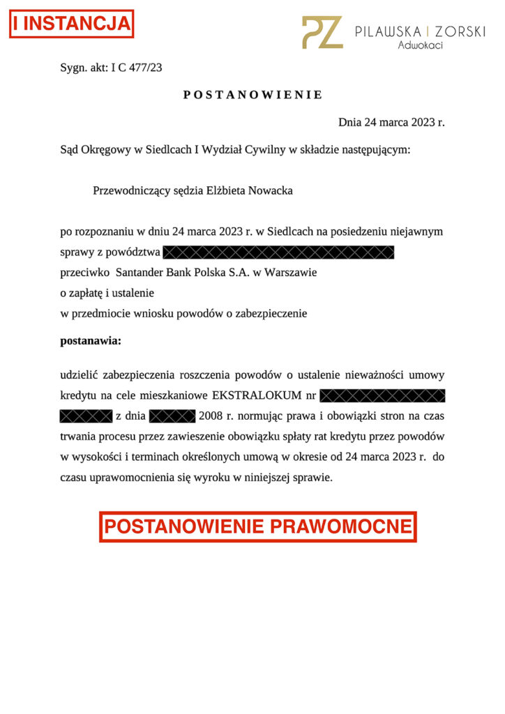 Jakiś czas temu informowaliśmy, że w sprawie naszych Klientów przeciwko Santander Bank Polska S.A. z siedzibą w Warszawie dot. Umowy kredytu indeksowanego kursem CHF Sąd Okręgowy w Siedlcach, I Wydział Cywilny, SSO Elżbieta Nowacka, sygn. akt I C 477/23, w dniu 24 marca 2023 roku wydał postanowienie o zabezpieczeniu zwalniające Powodów z obowiązku płacenia rat do czasu uprawomocnienia wyroku. Takich postanowień w prowadzonych sprawach uzyskujemy wiele, ale to zasługiwało na szczególną uwagę, bo zostało wydane w 3 DNI OD ZŁOŻENIA POZWU DO SĄDU (pozew wpłynął do Sądu 21 marca 2023 roku, postanowienie wydano już 24 marca 2023 roku).