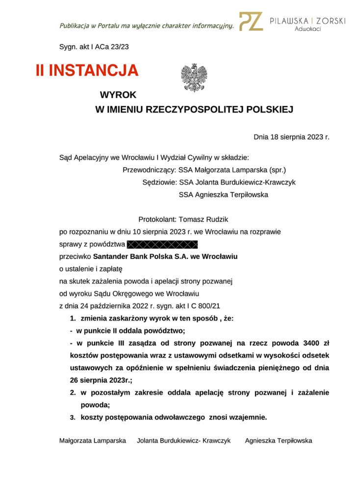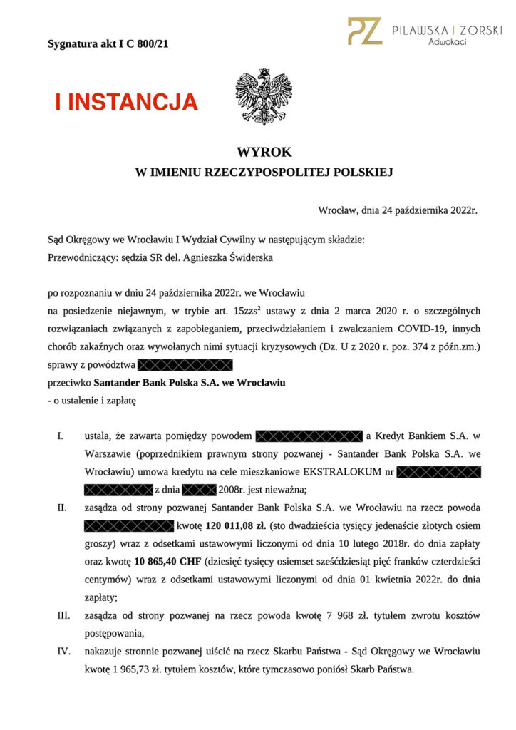 Informujemy o kolejnym PRAWOMOCNYM wyroku uzyskanym dla naszego Klienta w sprawie przeciwko Santander Bank Polska S.A. 👍👍👍