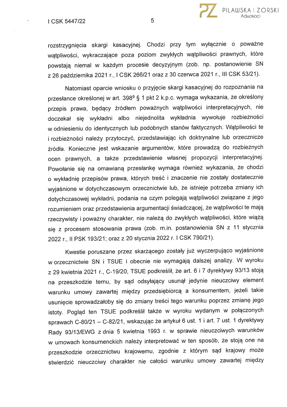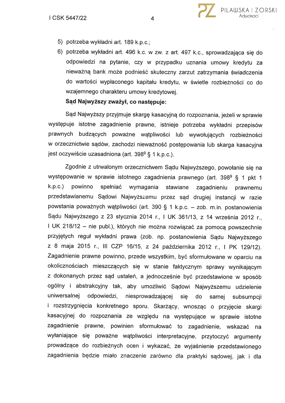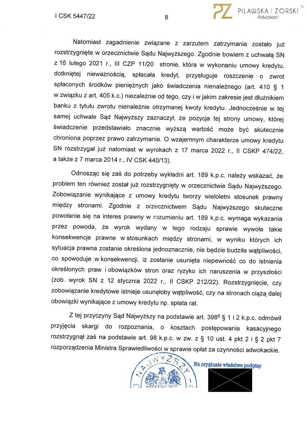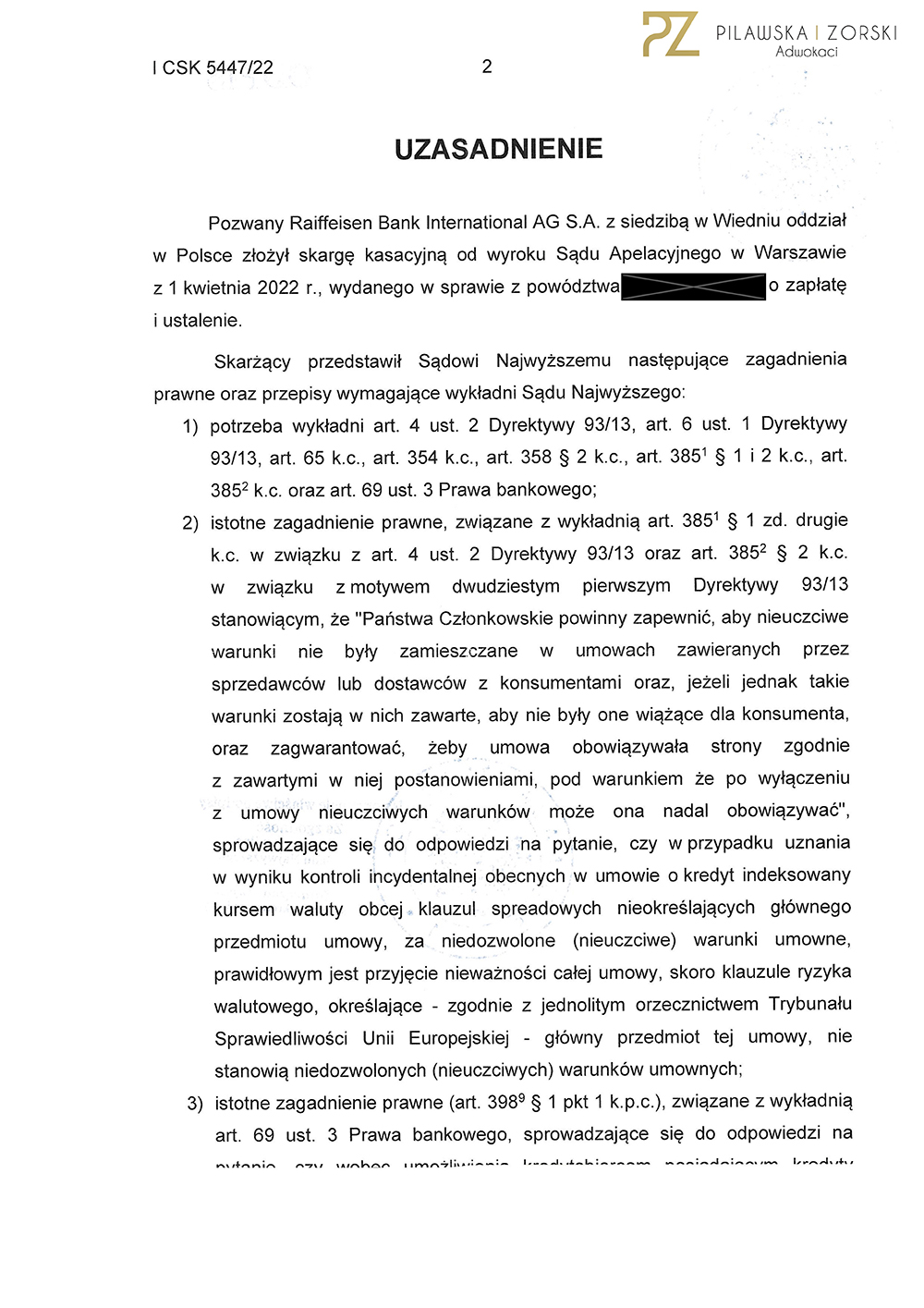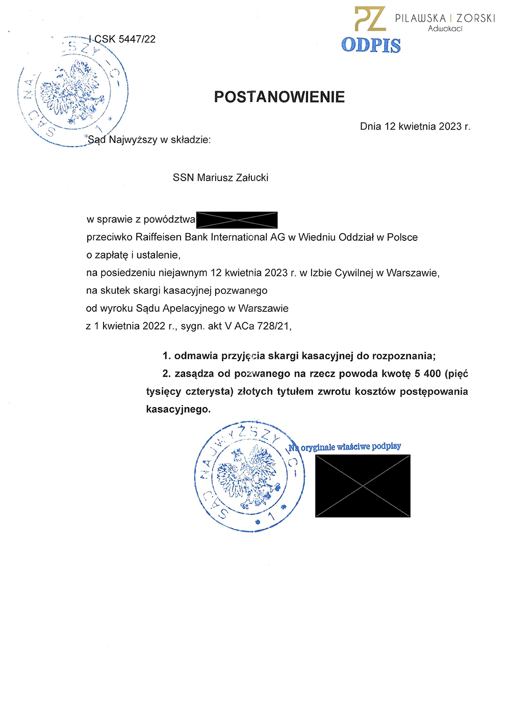 Wspaniałe wieści z Sądu Najwyższego. W kolejnej prowadzonej przez nas sprawie Sąd Najwyższy w składzie SSN Mariusz Załucki, sygn. akt I CSK 5447/22, odmówił przyjęcia do rozpoznania skargi kasacyjnej wniesionej przez Raiffeisen Bank International AG 🔥🔥🔥