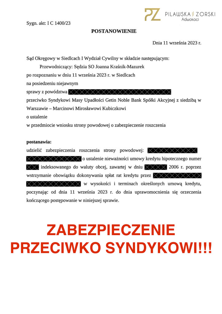 W jednej z nowszych spraw, w której pozew wpłynął do Sądu 11 sierpnia 2023 roku, czyli już po ogłoszeniu upadłości Getin Noble Bank S.A., Sąd Okręgowy w Siedlcach w dniu 11 września 2023 roku wydał postanowienie w przedmiocie zabezpieczenia i zwolnił naszych Klientów z obowiązku płacenia rat kredytu do czasu zakończenia postępowania.