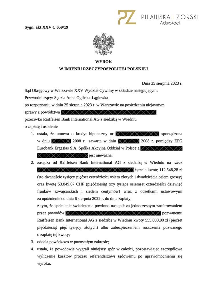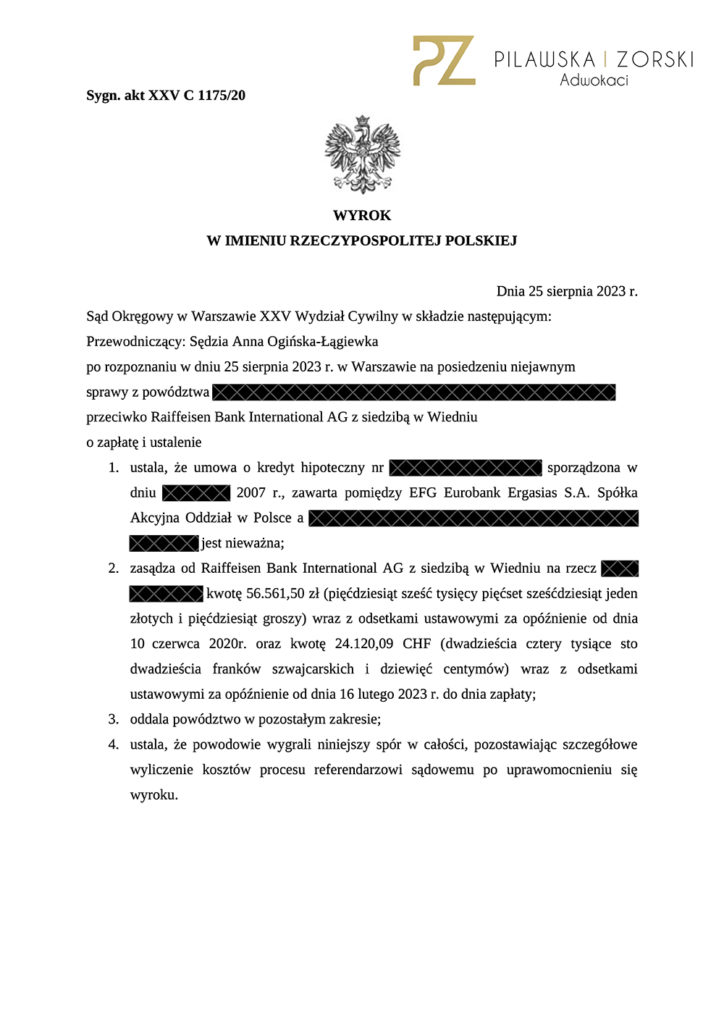 🔵 zasądził do Raiffeisen Bank International AG dochodzone kwoty, tj. 112.548,28 PLN i 53.849,07 CHF wraz z ustawowymi odsetkami za czas opóźnienia od dnia 6 sierpnia 2022 roku do dnia zapłaty,