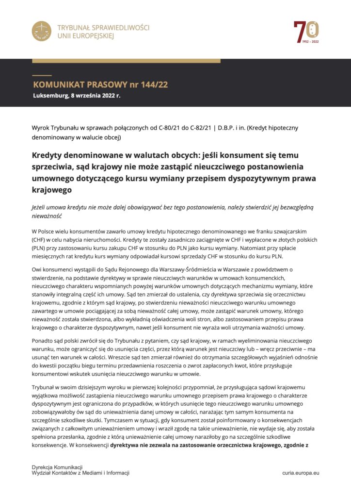 8 września 2022 roku to wspaniały dzień dla kredytobiorców posiadających kredyty indeksowane i denominowane kursem waluty obcej, w tym kursem franka szwajcarskiego, a fatalny dla sektora bankowego ❗️❗️❗️ Zdajemy sobie sprawę, że lektura wyroków TSUE bywa „trudna”, stąd poniżej w skrócie streszczamy, o co chodzi w dzisiejszym wyroku TSUE wydanym w połączonych sprawach C-80/21, C-81/21 i C-82/21.