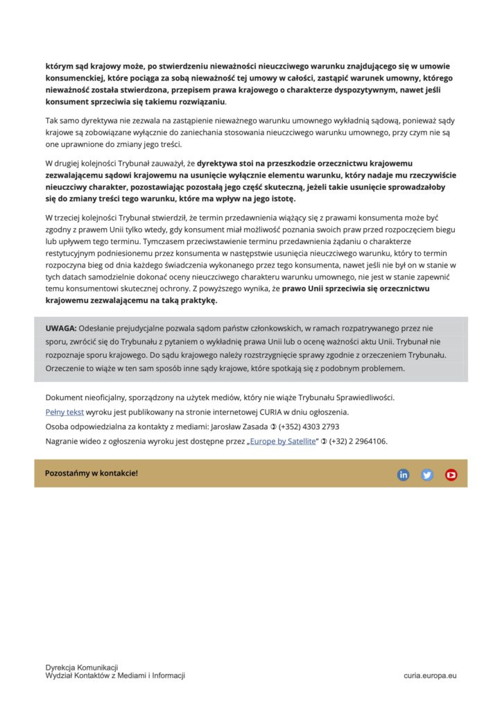 Trzecie zagadnienie wydawało się najbardziej oczywiste – dotyczyło tego, od kiedy można liczyć termin przedawnienia roszczeń majątkowych dla konsumentów. Czy powinien on biec od daty np. dokonania przelewu czy dopiero od momentu, w którym konsument dowiedział się, że jego umowa lub niektóre jej warunki są nieuczciwe. Trybunał również opowiedział się za szeroką ochroną konsumencką i stwierdził, że dopiero wiedza kredytobiorcy o nieuczciwości powoduje rozpoczęcie biegu przedawnienia. Nie ma więc przy pozywaniu banków znaczenia, czy umowa została zawarta 5 czy 15 lat temu, a jedynie, kiedy klient dowiedział się o tym, że może bank pozwać, bo ten zaproponował mu do podpisu prawnie wadliwą umowę.