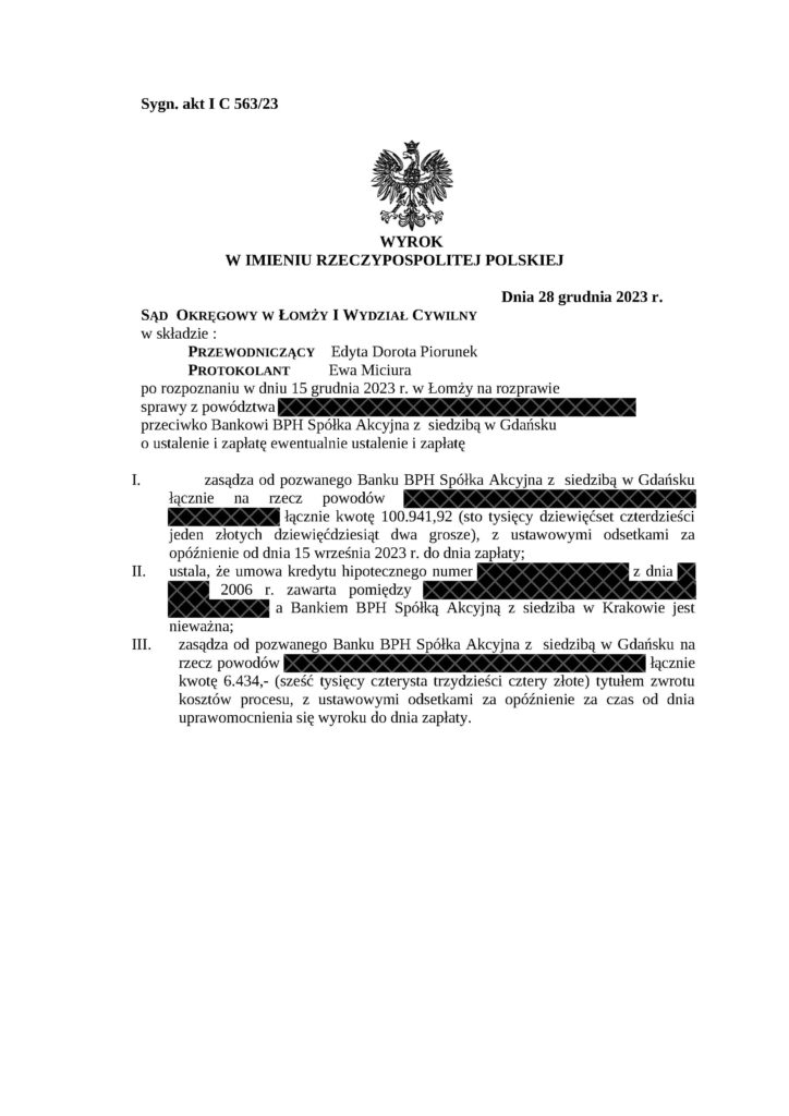 Tym razem Sąd Okręgowy w Łomży, I Wydział Cywilny, SSO Edyta Dorota Piorunek, w sprawie o sygn. akt I C 563/23 z powództwa naszych Klientów przeciwko Bankowi BPH S.A. z siedzibą w Gdańsku w dniu 28 grudnia 2023 roku wydał wyrok, w którym w 100 % uwzględnił Roszczenia kredytobiorców. Ponadto, odsetki za opóźnienie zostały zasądzone od doręczenia pozwu, a zarzut zatrzymania nie został uwzględniony 👏 👏 👏