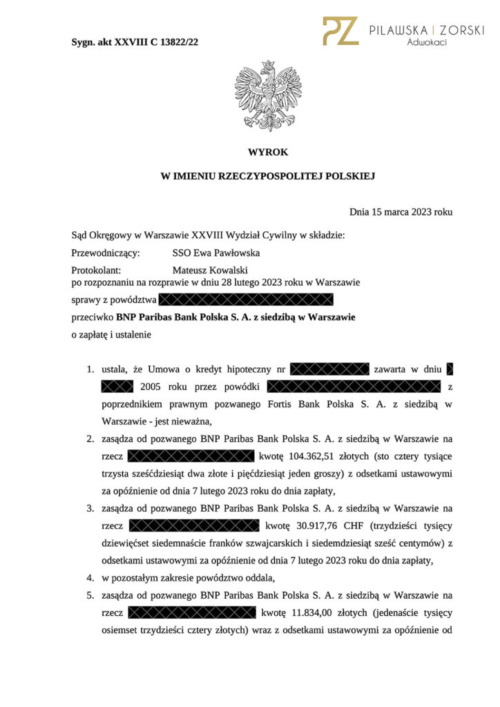 Miło nam poinformować, że w dniu 15 marca 2023 roku Sąd Okręgowy w Warszawie, XXVIII Wydział Cywilny, SSO Ewa Pawłowska, w sprawie z powództwa naszych Klientów przeciwko BNP Paribas Bank Polska S.A., sygn. akt XXVIII C 13822/22, wydał wyrok, w którym:
