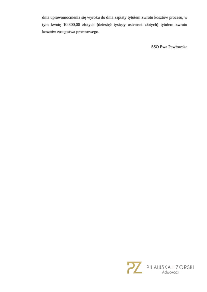 ✅ zasądził na rzecz Powodów wszystkie dochodzone kwoty: 104.362,51 PLN i 30.917,76 CHF wraz z odsetkami ustawowymi za czas opóźnienia od dnia 7 lutego 2023 roku do dnia zapłaty