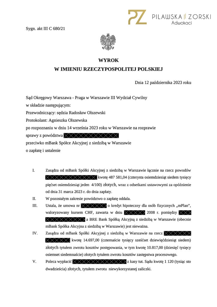 Informujemy, że wyrokiem z dnia 12 października 2023 roku Sąd Okręgowy Warszawa – Praga w Warszawie, III Wydział Cywilny, sygn. akt III C 680/21, SSO Radosław Olszewski, wydał wyrok w sprawie naszych Klientów przeciwko mBank S.A., w którym: