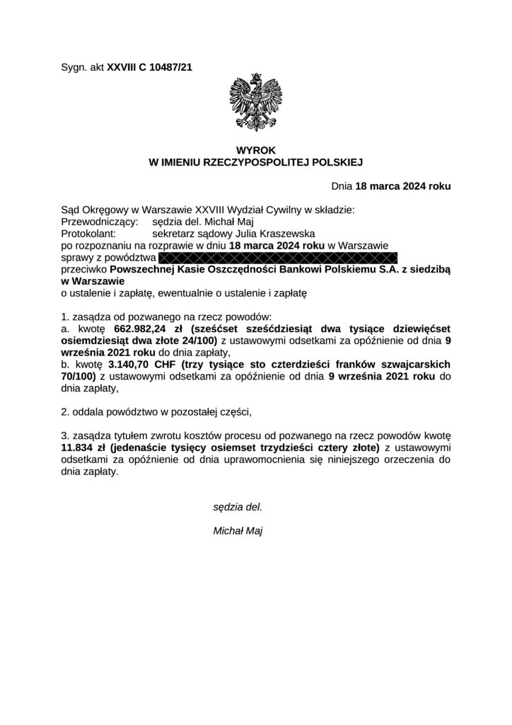 ✅ zasądził od PKO BP S.A. z siedzibą w Warszawie na rzecz naszych Klientów kwoty 662.982,24 PLN oraz 3.140,70 CHF wraz z odsetkami ustawowymi za opóźnienie liczonymi od dnia 9 września 2021 roku do dnia zapłaty,