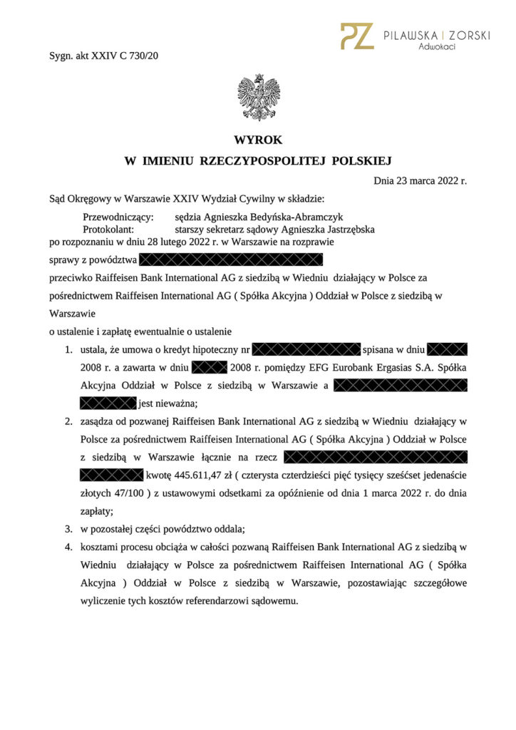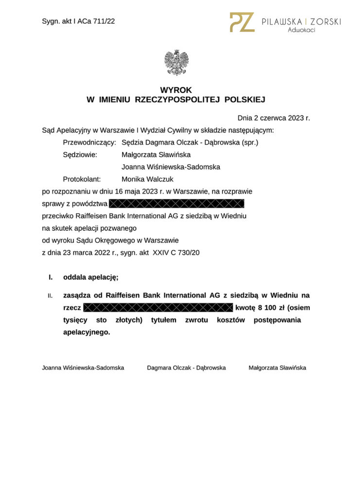 Dziś Sąd Apelacyjny w Warszawie, I Wydział Cywilny, w składzie: SSA Dagmara Olczak – Dąbrowska, SSA Joanna Wiśniewska-Sadomska i SSA Anna Strączyńska, w sprawie o sygn. akt I ACa 711/22, wydał wyrok, w którym oddalił w całości apelację Raiffeisen Bank International AG z siedzibą w Wiedniu i tym samym utrzymał w mocy Sądu Okręgowego w Warszawie, XXIV Wydział Cywilny, SSO Agnieszka Bedyńska-Abramczyk, z dnia 23 marca 2022 roku w sprawie o sygn. akt XXIV C 730/20, w którym Sąd I instancji: